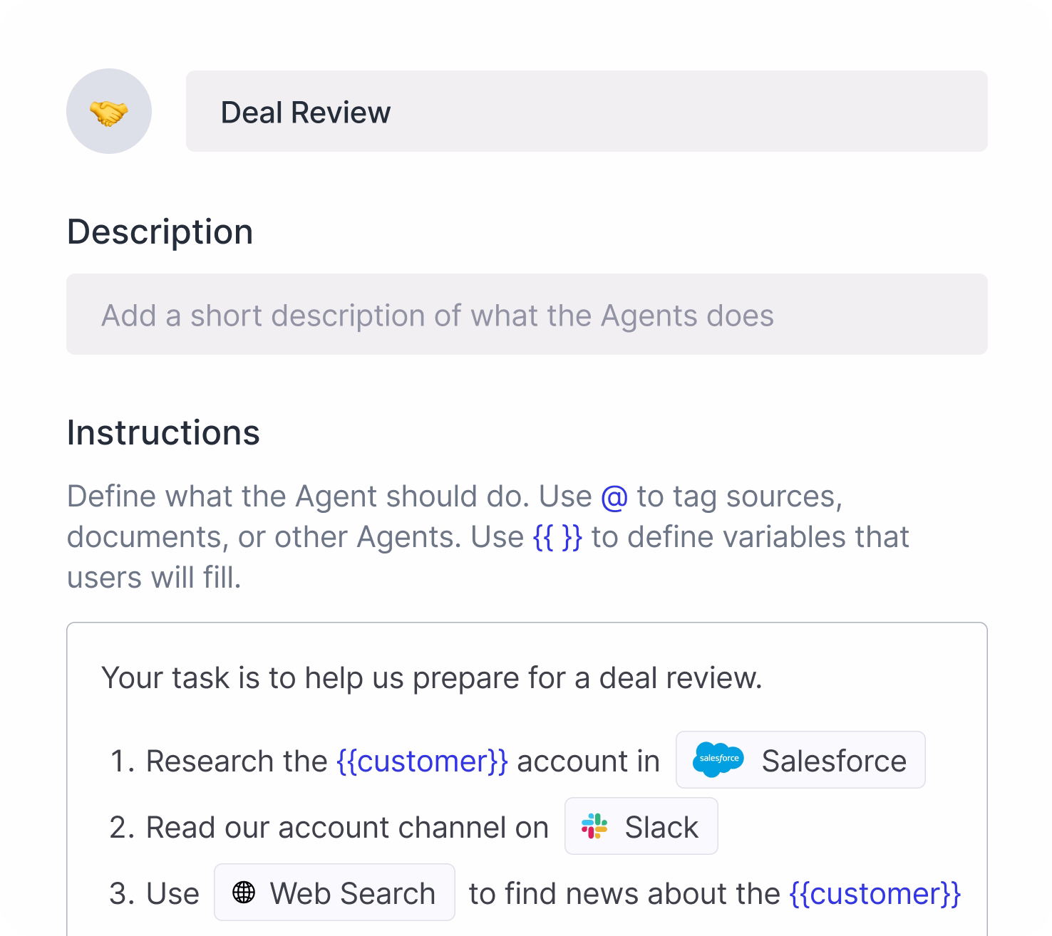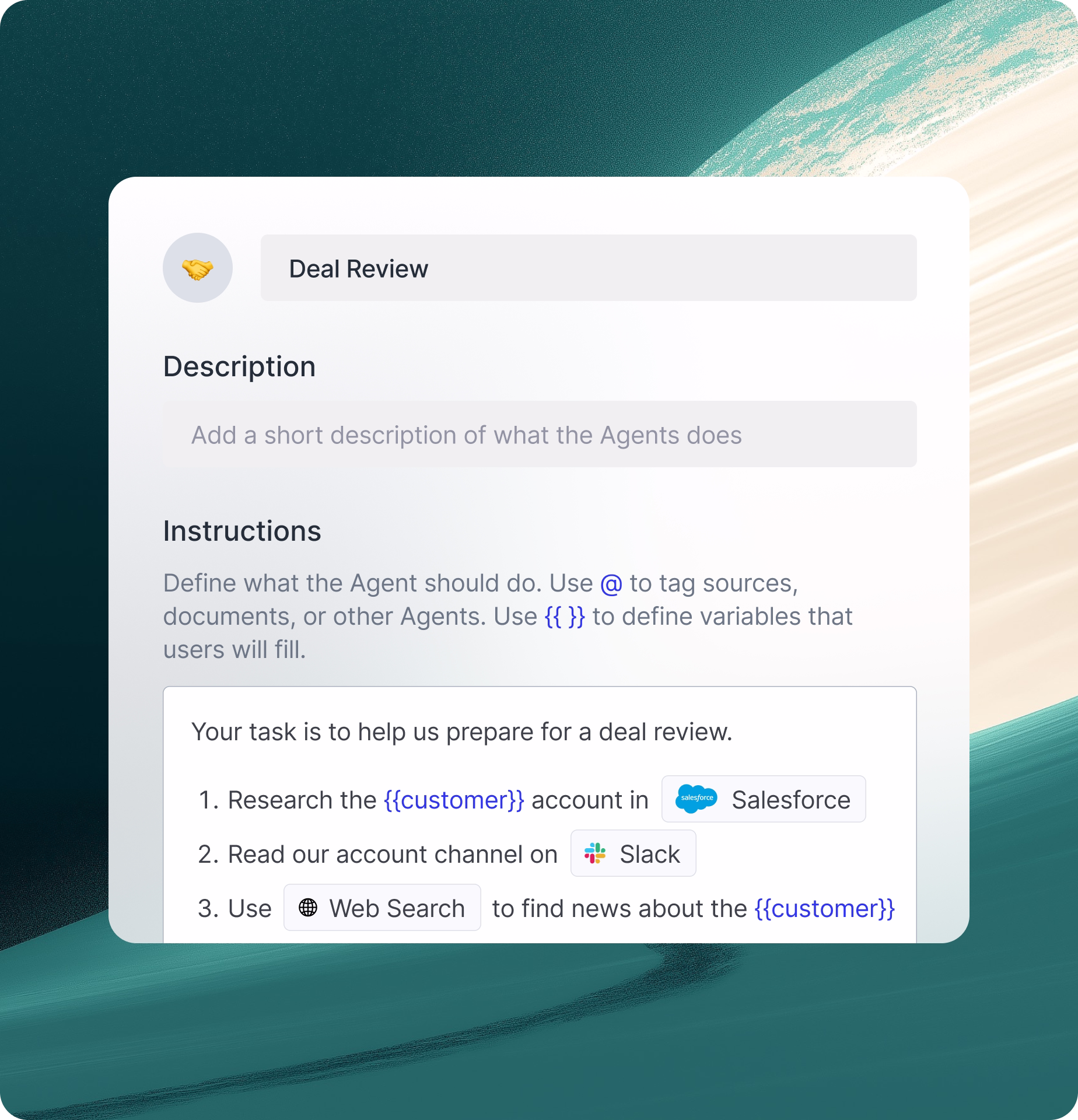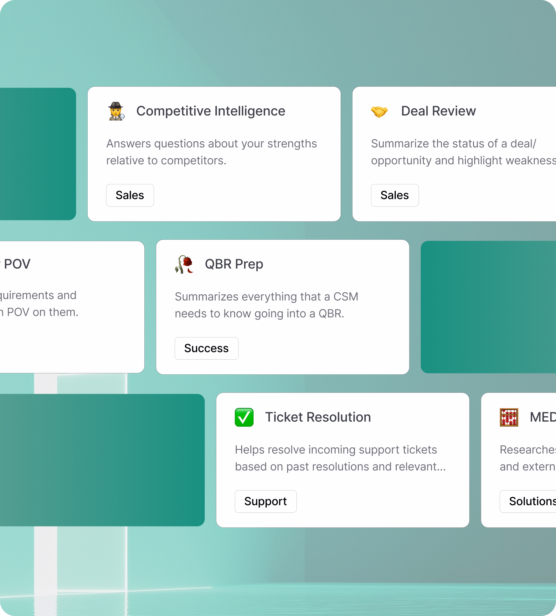 Choose from pre-built agent templates for sales, solutions, customer success and support. Share your own templates with your team.