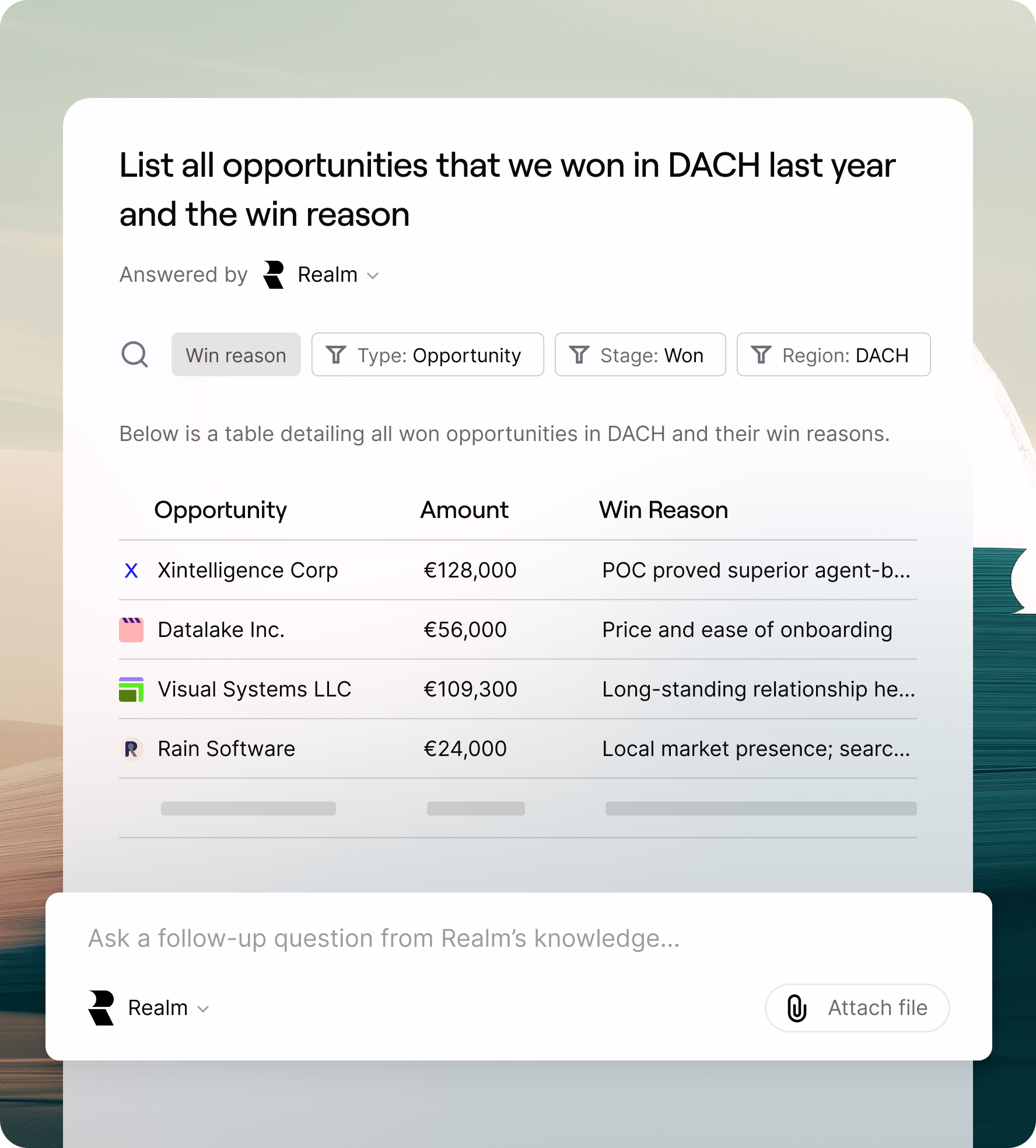 Built on bleeding-edge AI, Realm understands language and context, and delivers the exact knowledge you need.