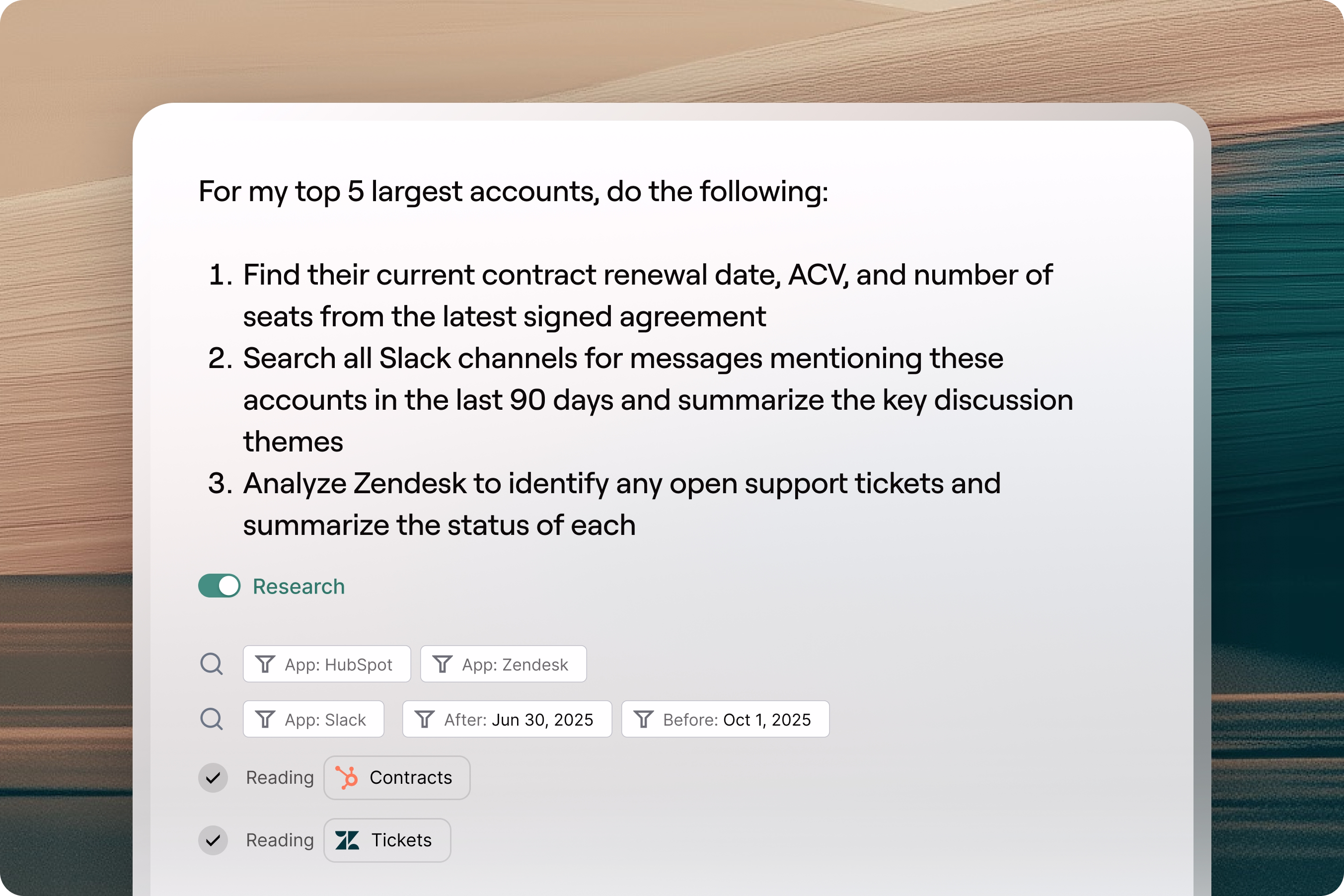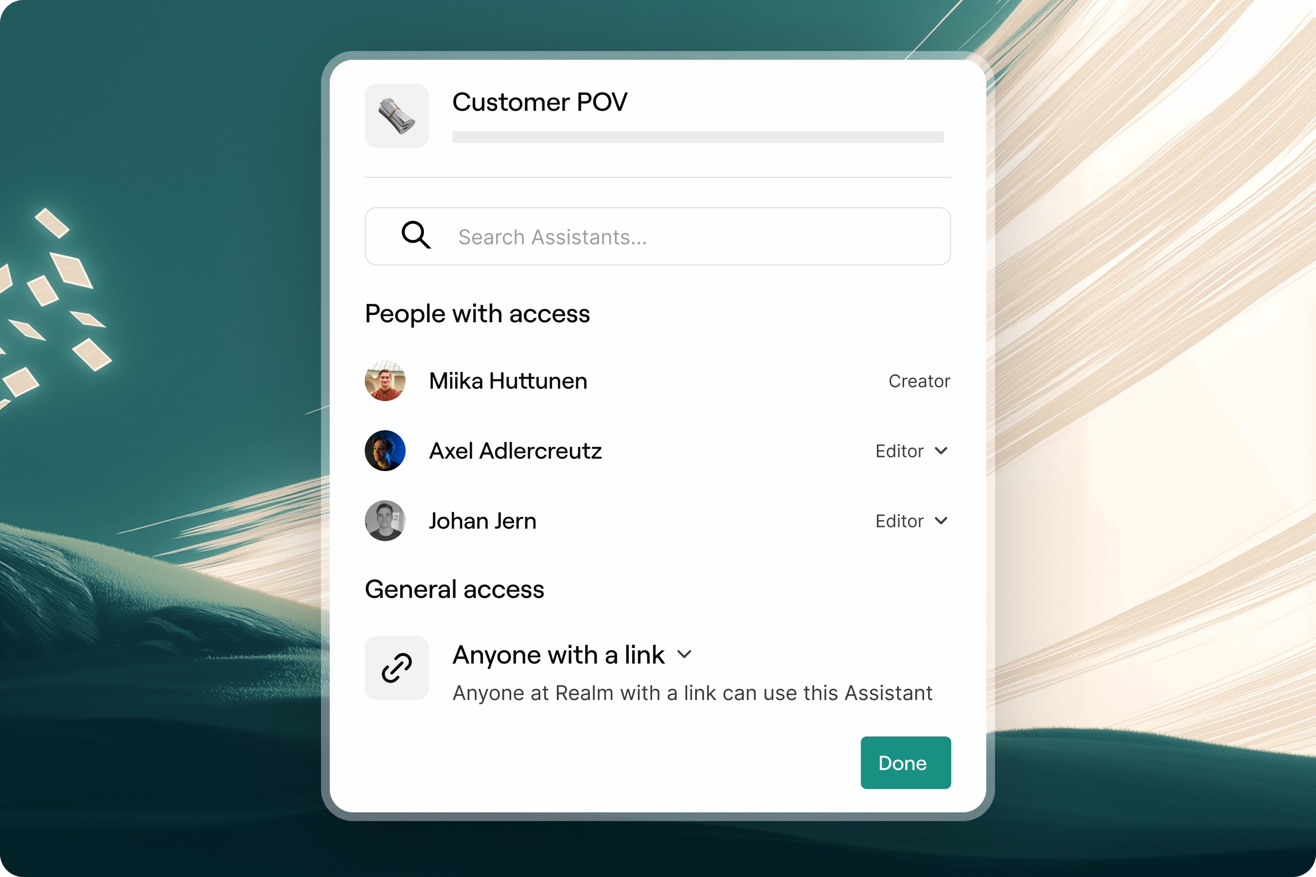 Realm Assistant connects to your company's knowledge sources to provide instant, trustworthy answers. It intelligently plans its approach, searches for relevant information, and synthesizes it into a comprehensive, cited responses.