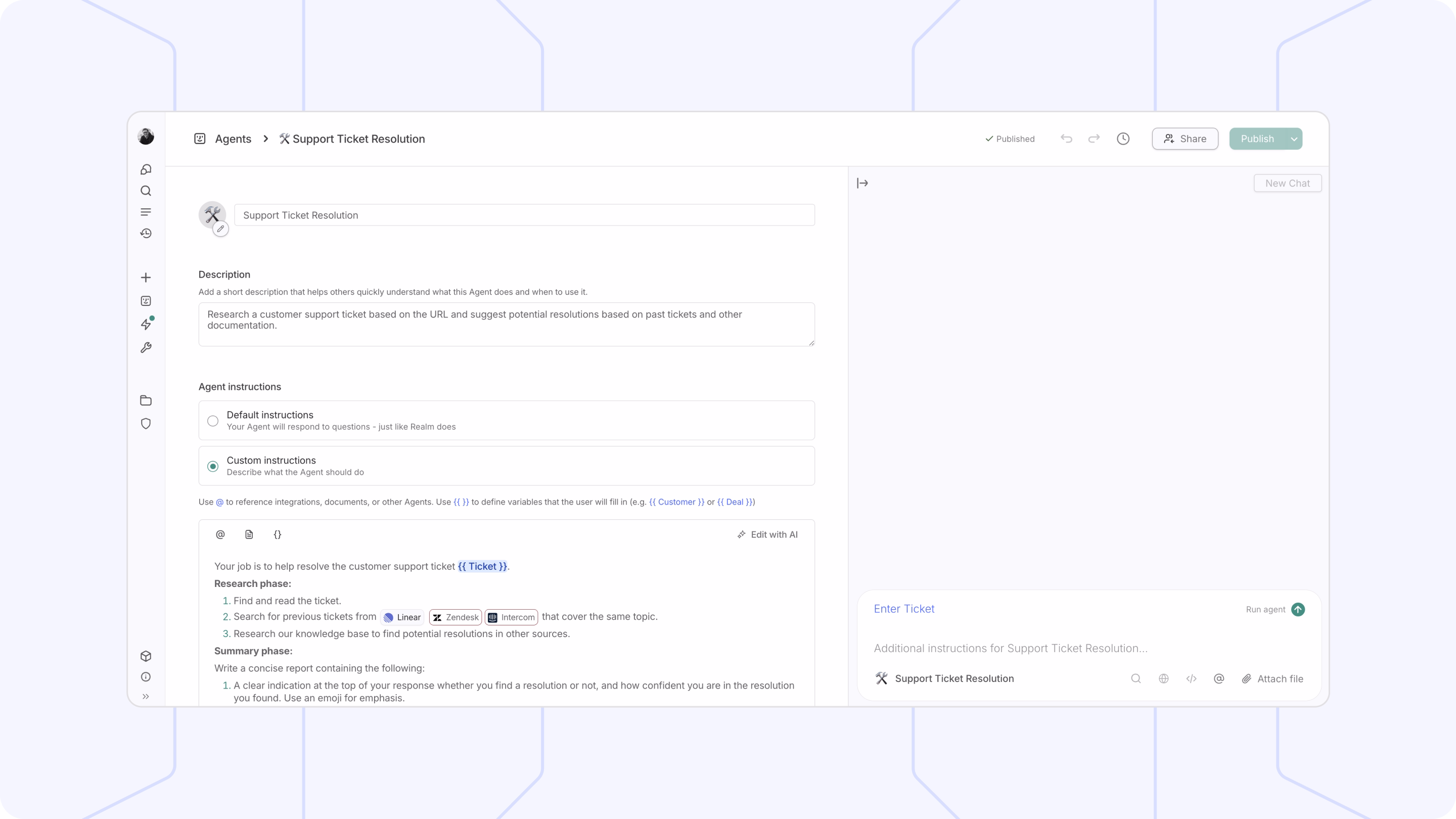 If you're looking for a pre-built solution, Realm's Support Ticket Resolution Agent is purpose-built for this. It analyzes incoming tickets, searches your knowledge base and past resolutions, and either suggests solutions to your agents or resolves tickets automatically based on confidence thresholds you set.