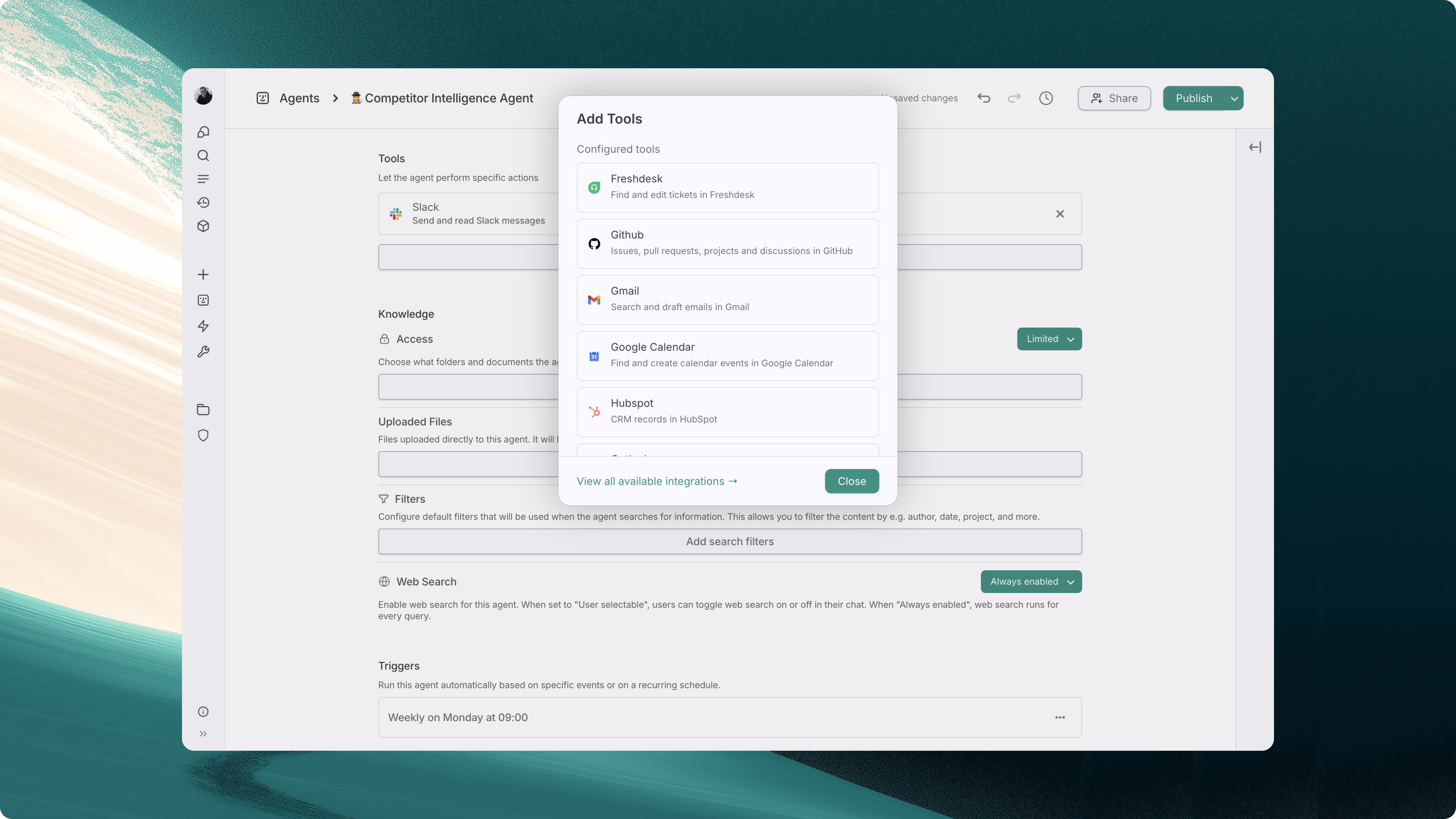 We are continuously working to add more tools, and if your team relies on a tool that our agents don’t yet support, please don’t hesitate to get in touch.