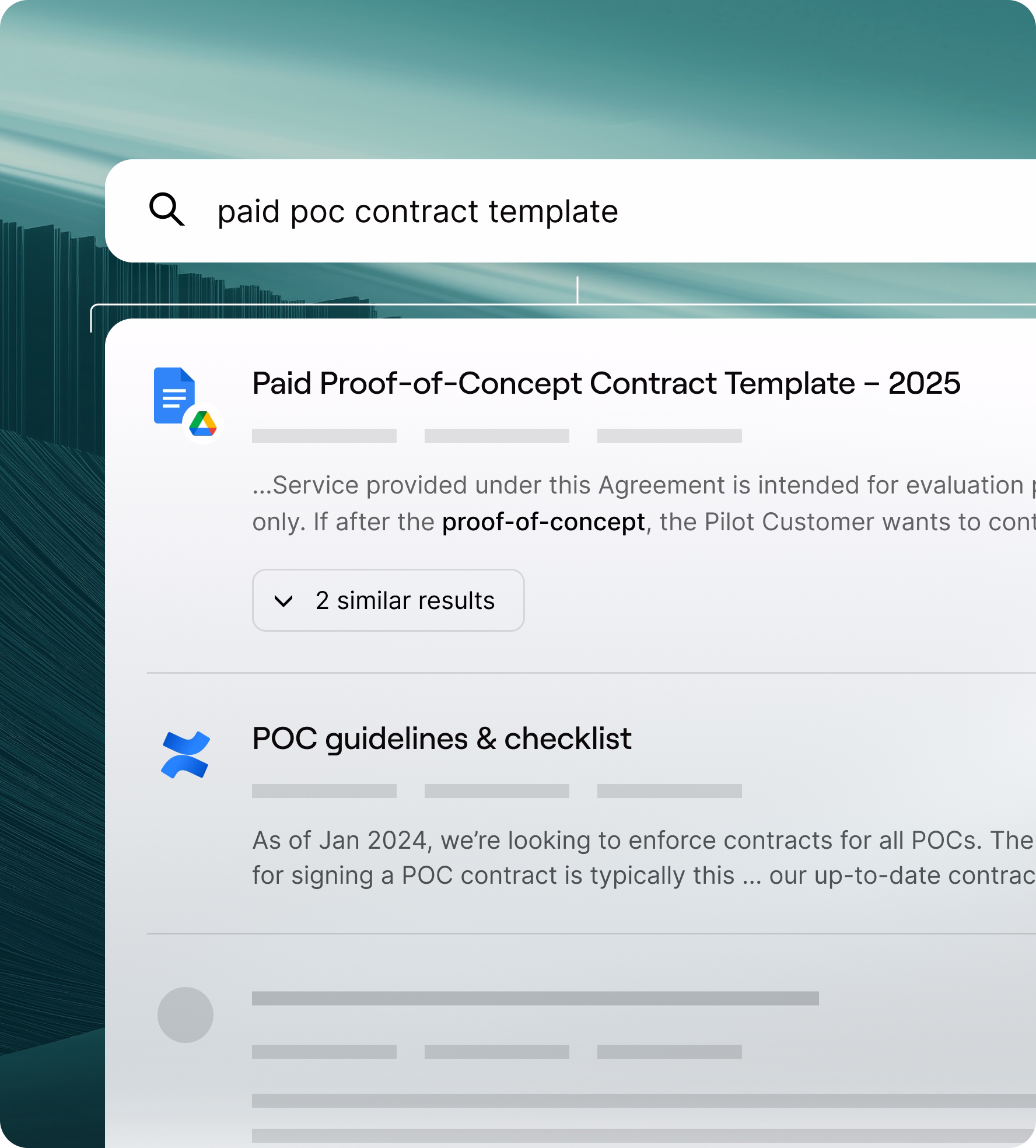 Search simultaneously across all your apps from CRM and support tickets to internal documents, wikis, and technical documentation without context switching
