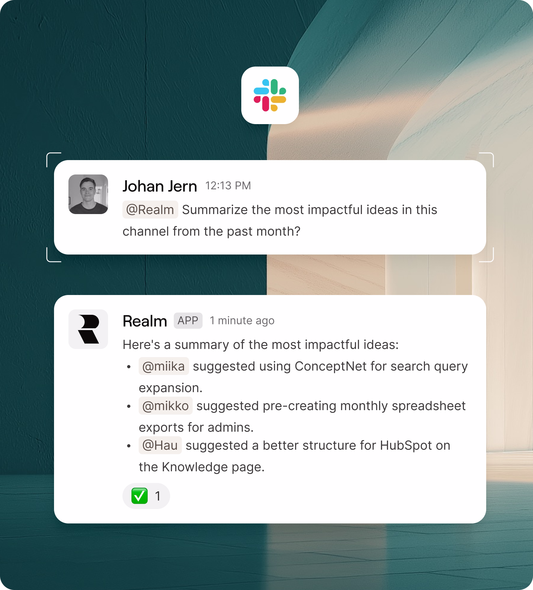 Ask questions from Realm just like you’d ask any other colleague. Get immediate, accurate answers from your company's knowledge base without leaving Slack.